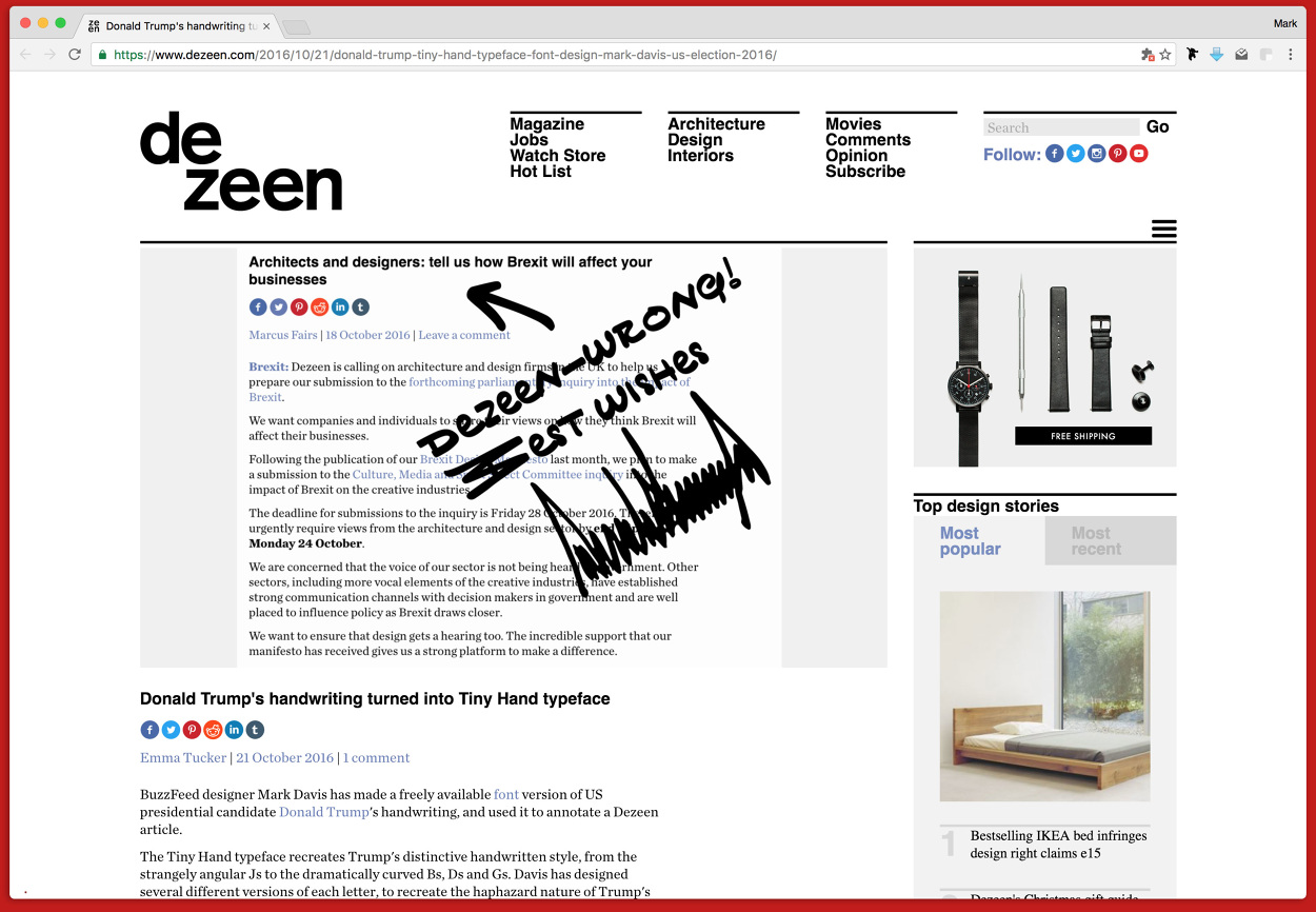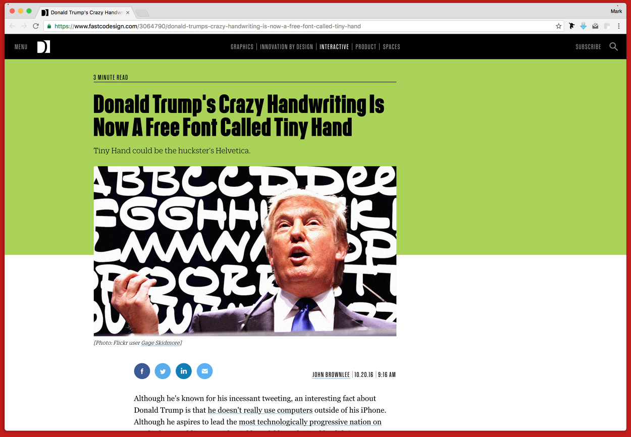 My art director at BuzzFeed News Ben King asked me to make a handwriting typeface based on the distinctive scrawl of Donald Trump for this satire piece. I cranked it out in about two days.He then wrote a short article on it, and now you too can download the typeface for free!